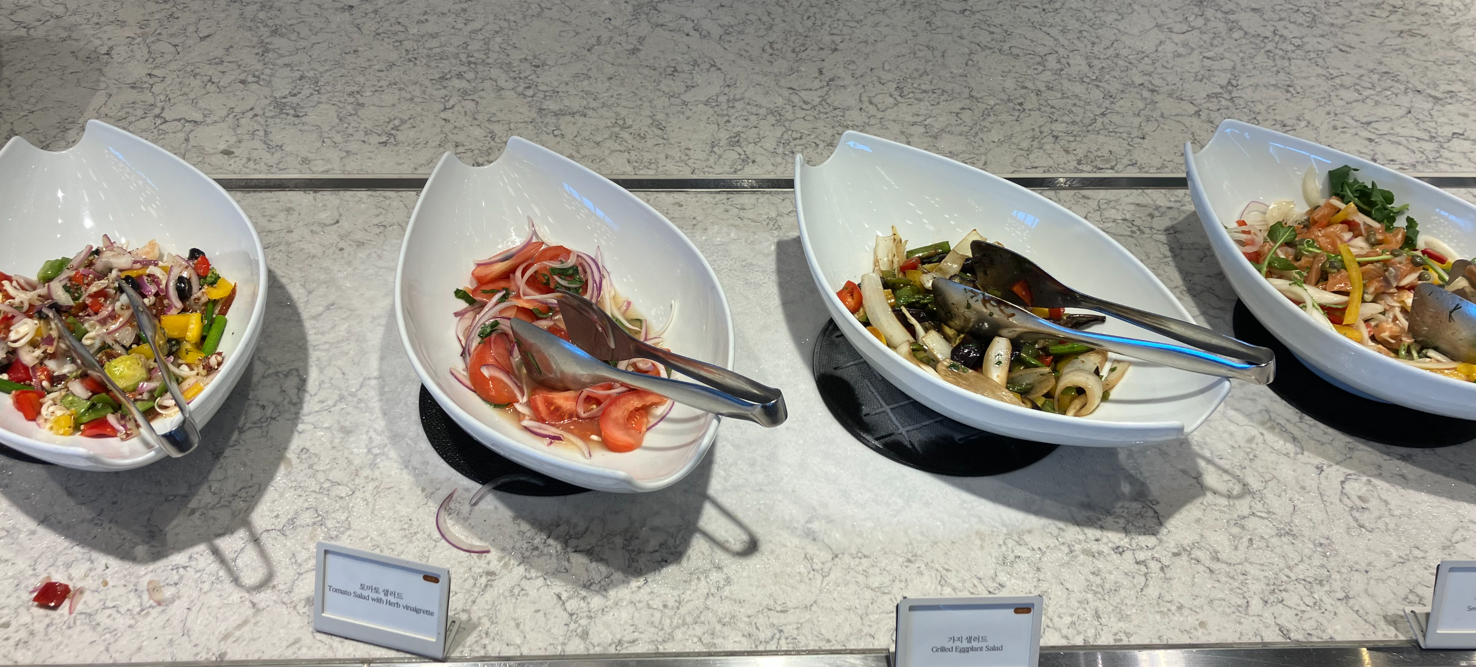 샐러드 4종. 해산물, 토마토, 가지, 훈제연어